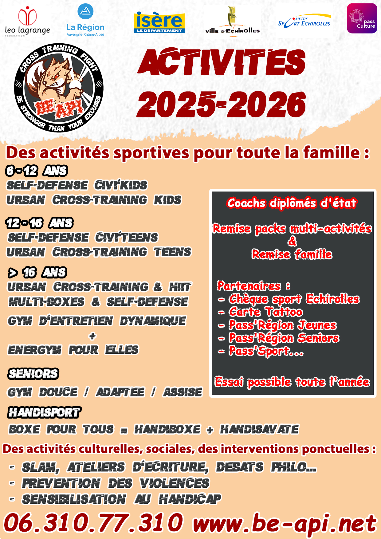Règlement intérieur + Docs Liste des dispositifs de subvention saison 2025-2026 Formulaire-QS-Sport-Majeurs Formulaire-QS-Sport-Mineurs Autorisation parentale pour les mineurs Fiche inscription imprimable 2025/2026 adultes Fiche inscription imprimable 2025/2026 ados et enfants Fiche inscription session gym douce été 2025 Consulter le règlement intérieur Consulter la notice d’assurance complémentaire Affiche n°1 activités 2025-2026 Affiche n°2 activités 2025-2026 Affiche Cross-Training Affiche ENERGYM Affiche SENIORS Affiche HandiBoxe Suivez nous sur : Cliquer pour envoyer un lien par e-mail à un ami(ouvre dans une nouvelle fenêtre) E-mail Cliquez pour partager sur Facebook(ouvre dans une nouvelle fenêtre) Facebook J’aime chargement…
